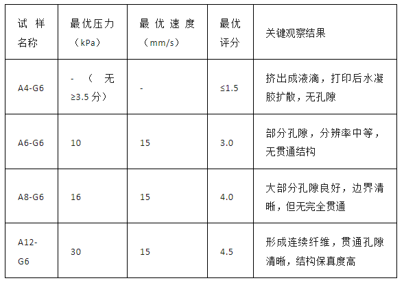 可打印性:手动挤出时能形成连续纤维(非液滴),适配挤出 3D 打印;优化打印参数(30kPa 压力、15mm/s 速度)后评分达 4.5/5,显著高于 A4-G6(≤1.5 分)、A6-G6(3.0 分)、A8-G6(4.0 分);打印精度达 99.94%,是唯一能形成贯通孔隙结构的配方(其他配方无孔隙或仅部分孔隙)。