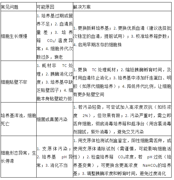即使操作规范,细胞培养中也可能出现各种问题,以下是高频问题及解决方案: