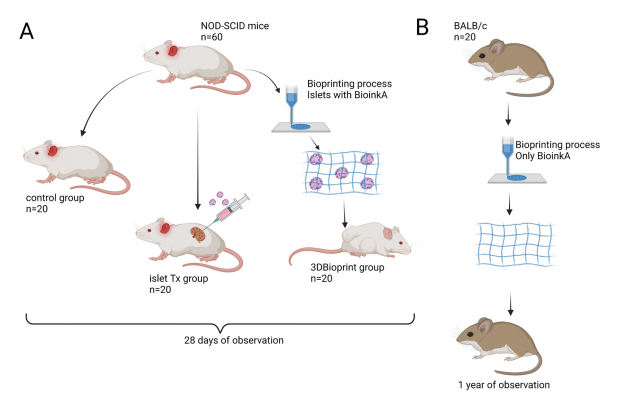 图1.本实验的流程示意图。本实验旨在分析两大核心目标:(A)生物打印胰岛在在体模型中的功能评估;(B)植入不含胰岛的生物材料后,受试机体预设反应状态的发生情况分析。