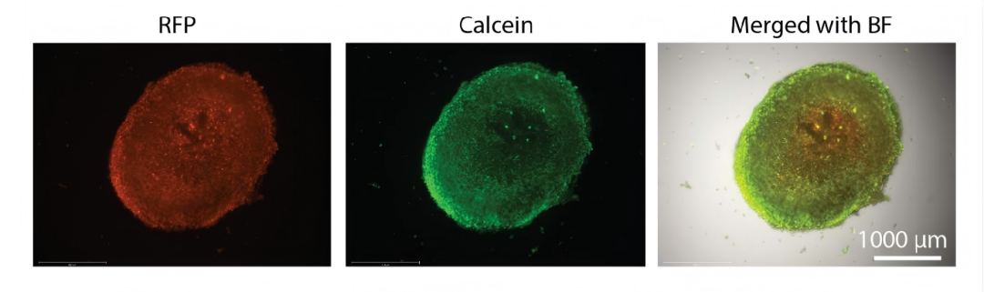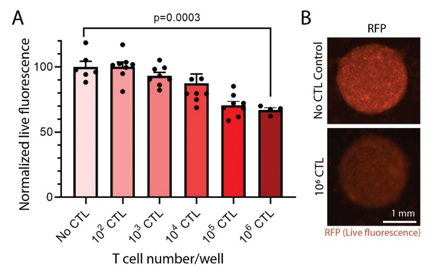 图2. 肿瘤细胞的生长和生存力。对打印的肿瘤进行RFP 荧光成像,并用钙黄绿素AM 染色以确定T 细胞筛选前第5 天的细胞活力。