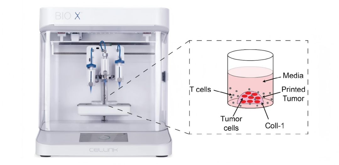 图1. 肿瘤的三维(3D)生物打印。使用BIO X 的液滴打印功能,用胶原蛋白对Lewis 肺癌细胞(LLC-1)进行胶原蛋白印刷。将胶原蛋白液滴(肿瘤)热固化并在DMEM 培养基中保持5 天,然后再与T 细胞共培养。