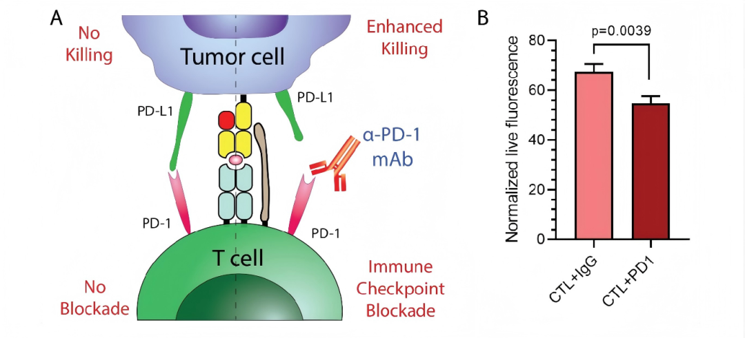 图4. 免疫检查(A)显示了免疫检查点阻断测定的示意图。单克隆抗PD1 抗体阻断了PD1 与PD-L1 之间的相互作用,从而增强了T 细胞对肿瘤细胞的杀伤力。(B)在IgG 同种型对照或抗PD1 抗体存在下,将3D 生物打印的肿瘤细胞与初免化的T 细胞以5:1 的E:T 比例共培养。PD1 阻断显示出对靶细胞的增强杀伤作用。