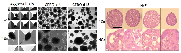图2:源自HepaRG细胞的球状体的生成过程。(左图)CERO和Aggrewell诱导的球状体的宏观分析。(右图)对各类源自HepaRG 的球状体进行的H/E组织学分析.用于病毒表达分析。比例尺:100um。
