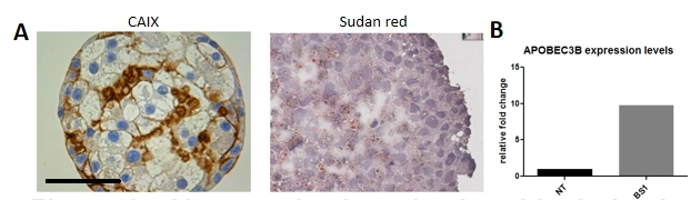 图3:源自HepaRG细胞的球状物的表征。(A,左图)球状物中缺氧标志物CAIX的表达。(A,右图)苏丹红染色对冷冻切片上脂质的识别。CERO和Aggrewell诱导球状物的宏观分析。(C)LTbR激动剂(BS1)(Lucifora等,<<科学>>2014年)刺激后细胞内抗乙型肝炎病毒因子APOBEC3B的表达分析。比例尺:100um。