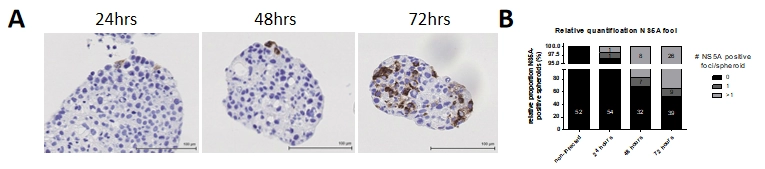 图4:Huh7衍生球状体中HCV复制情况随时间的变化。(A)对HCV复制情况随时间变化(24-72小时)的分析。(B)对整体感染实验随时间变化的量化结果。标尺条的大小已有所说明。
