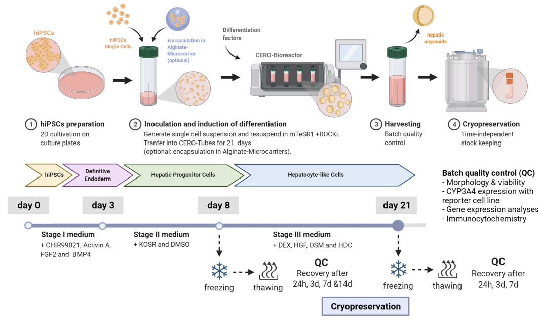 CERO 3D 悬浮培养平台的核心优势,是覆盖 “iPSC 制备→分化诱导→收获→冻存” 的完整研究链路,流程清晰且可灵活调整: