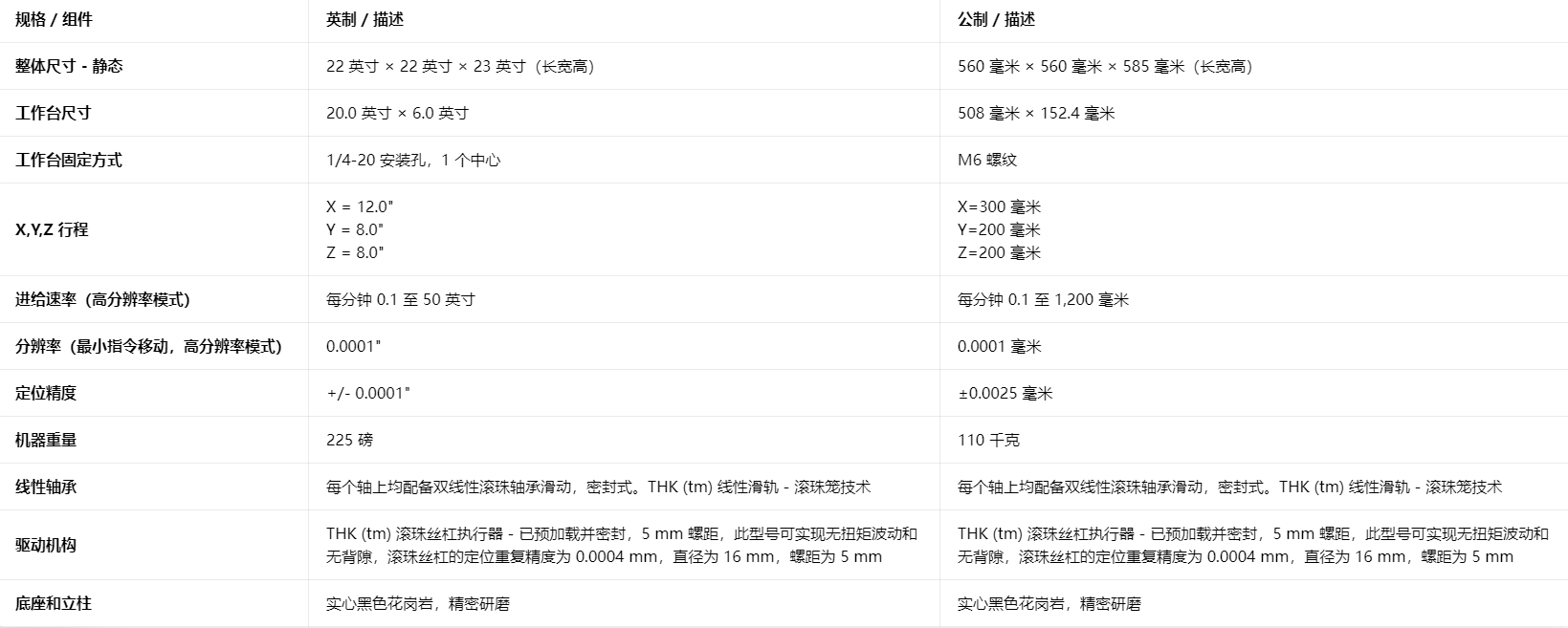 | Mini-Mill/GX | 黑色花岗岩 (精密研磨) | ±0.0001" | 0.0001" | 50 ipm | 225 lbs | THK™ 笼式球导轨 |